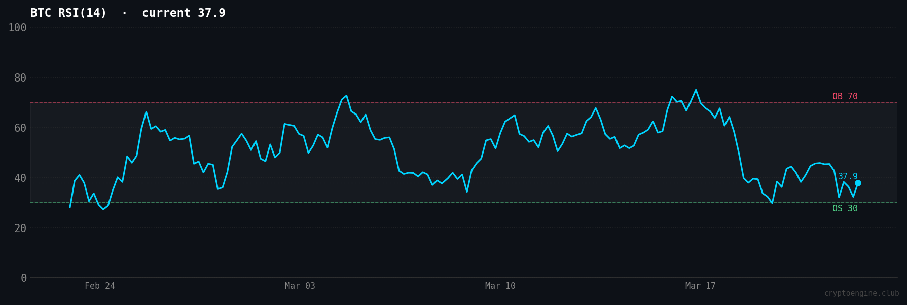 For BTC, the daily chart (RSI 14) is the most-watched timeframe, and that's what the 37.9 reading reflects. But if you're sizing a position based on a daily RSI reading, you should at minimum know what the weekly and 4-hour RSIs look like. All three in the same direction is a cleaner setup than one timeframe flashing a signal while the others are neutral.