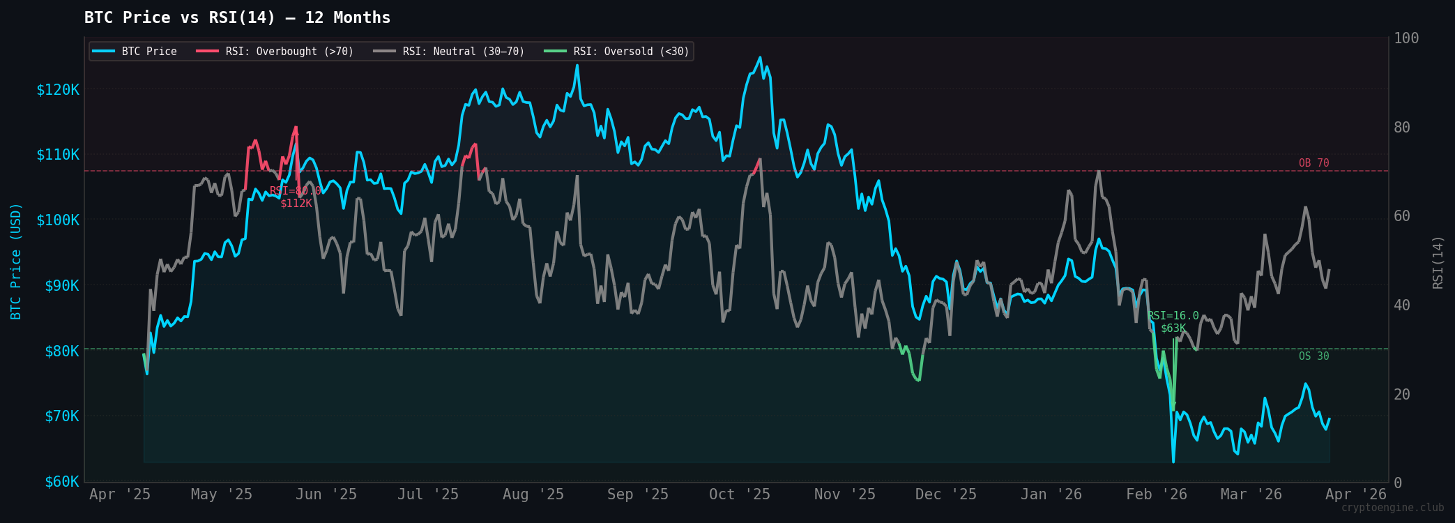 We pulled 351 days of daily BTC closes (April 2025 through March 24, 2026) and computed RSI(14) for each day. Here's how the readings broke down: