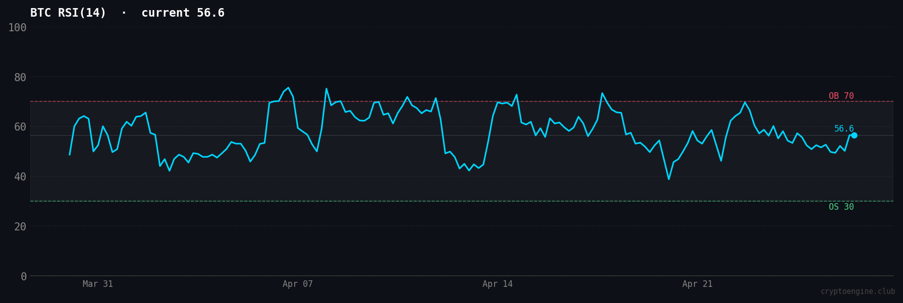 What is BTC RSI at this week? Bitcoin's RSI(14) sits at 61.4 as of April 26, 2026, a neutral reading with improving momentum. BTC is not overbought yet, and it is trading near $79,000 after a 19.9% recovery over the past 30 days.