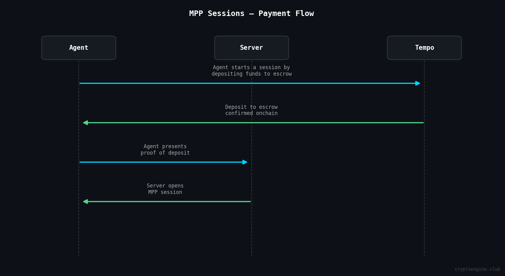 MPP supports multiple payment rails: Tempo stablecoins (TIP-20), Stripe cards, Lightning BTC, Solana, and Stellar. CryptoEngine uses Tempo's TIP-20 stablecoin on Tempo mainnet.